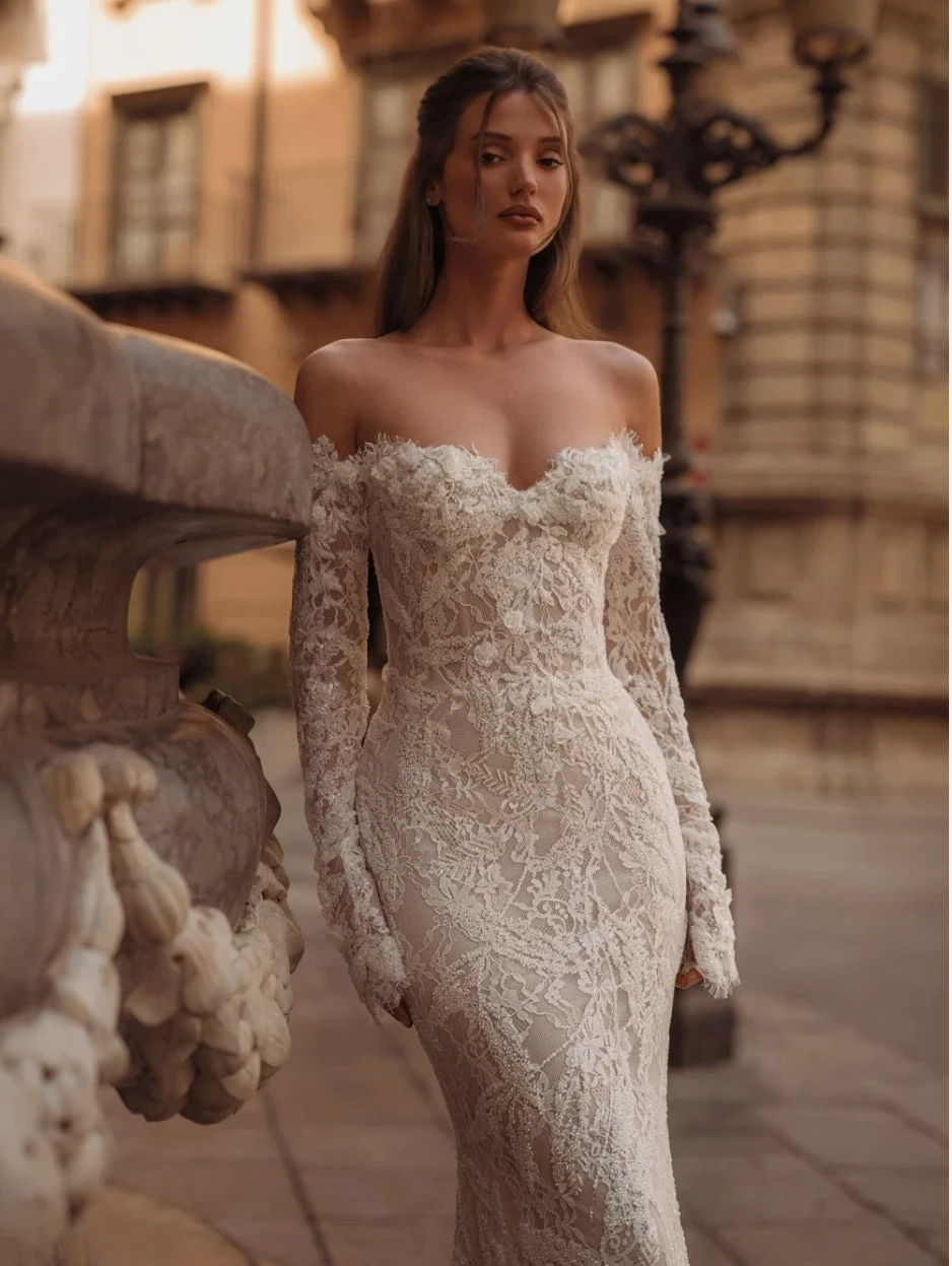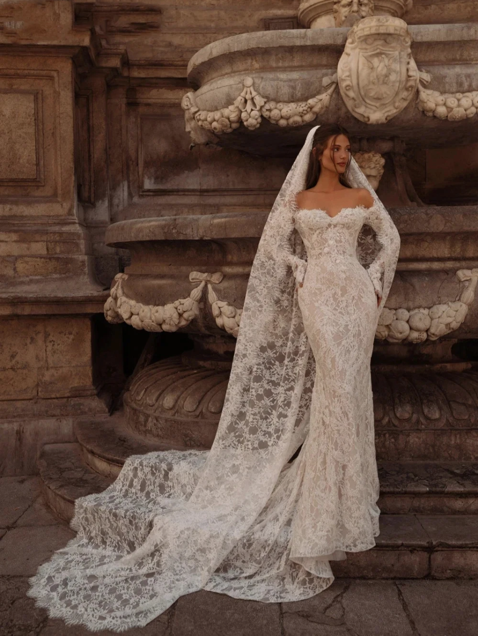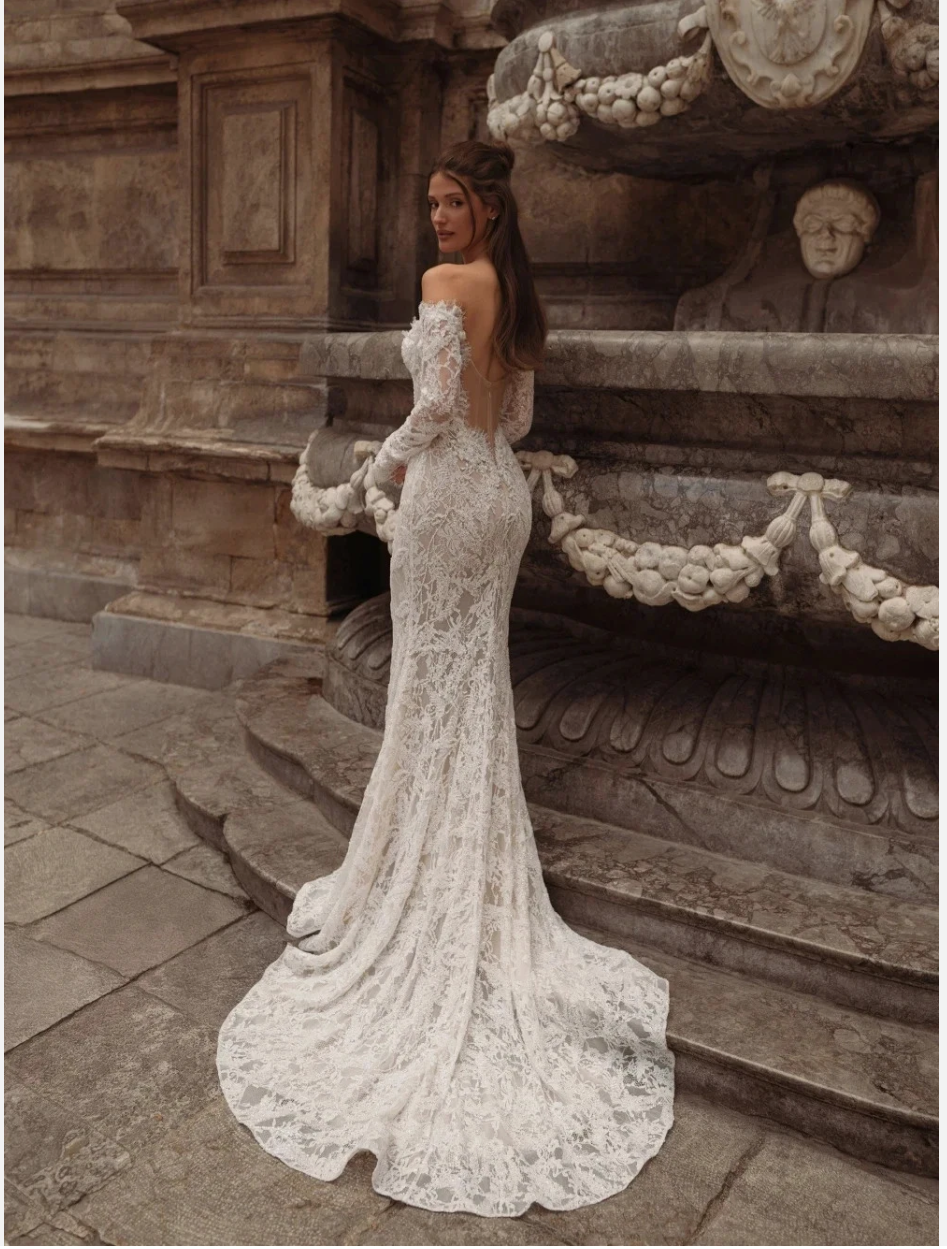 The fitted mermaid silhouette contours through the waist and hips before flowing into a graceful lace train, creating an elongated and statuesque bridal look. Sheer lace long sleeves with delicate textured edges add softness and romance while maintaining a high-fashion aesthetic.